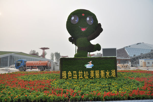 近日,一個(gè)特大號(hào)“湖寶”正式亮相衡水湖馬拉松廣場,活潑可愛、動(dòng)感俏皮的形象引來眾多游客爭相觀看、拍照。為迎接2013衡水湖國際馬拉松賽,衡水市園林局設(shè)計(jì)制作了這個(gè)大型立體花卉雕塑。它以馬拉松賽吉祥物“湖寶”為原型,高8米,長、寬各5米,采用五色草、佛甲草等組裝而成,主色調(diào)為綠色。下面是用矮牽牛、串紅、國慶菊等組成的花壇。這個(gè)“湖寶”動(dòng)感十足,以奔跑的姿勢亮出勝利的手勢,仿佛在歡迎世界各地體育健兒相聚衡水。 據(jù)悉,本著節(jié)儉原則,“湖寶”的鋼筋骨架今后將重復(fù)利用,每年夏秋季花草長勢好的季節(jié),都會(huì)在湖畔與游客見面,成為衡水湖景區(qū)的標(biāo)志性景觀。